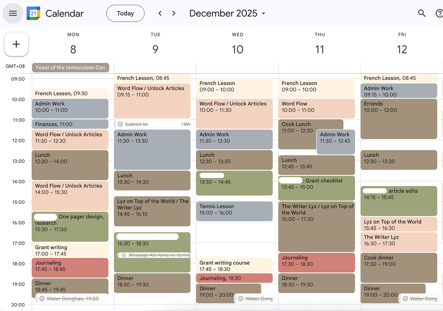 Whenever we talk about productivity, my Google Calendar gets a lot of laughs and horrified looks. It may seem over the top to a lot of people—color-coded and time-blocked, all the way down to meals. But it’s a system that I have worked so hard to refine through the years. It’s the system that got me out of the despair of never having enough time to write for myself. It’s the system that taught me to prioritize writing over everything else—instead of giving a huge chunk of the day when I am most creative (mornings) to menial tasks like admin work.